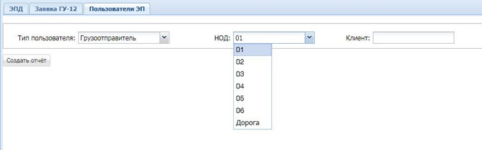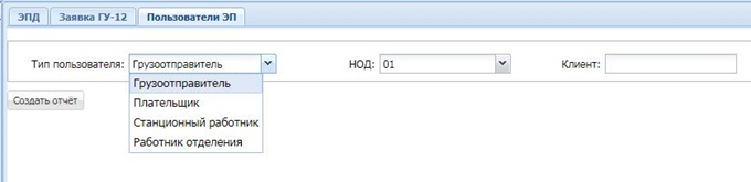 При выборе типа пользователя «Грузоотправитель» и соответствующего кода отделения в отчет попадают клиенты, зарегистрированные по выбранному отделению, у которых есть действующие сертификаты (заключены договора с ЦЗИ).