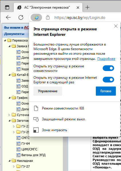 по кнопке «Добавить» дополнить перечень «Страницы в режиме Internet Explorer» адресом https://portal.isc.by/ooiscz/index.do, если он отсутствует в списке.