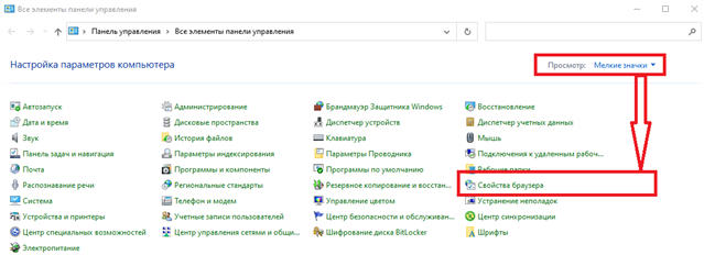 выбрать пункт «Свойства браузера» (если он не виден в списке, изменить режим просмотра на «Мелкие значки»)