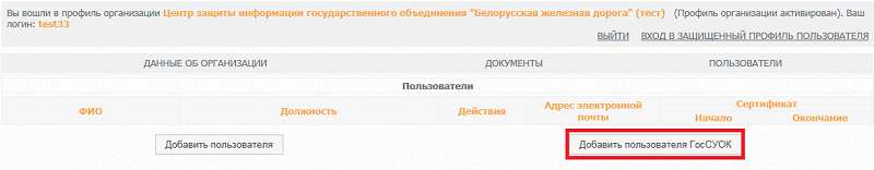 в главном меню выбрать форму «Пользователи», нажать на кнопку "Добавить пользователя ГосСУОК"