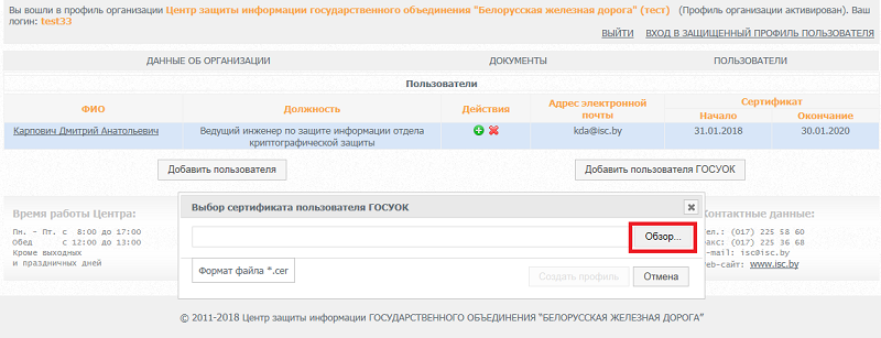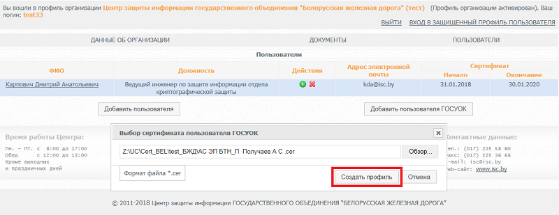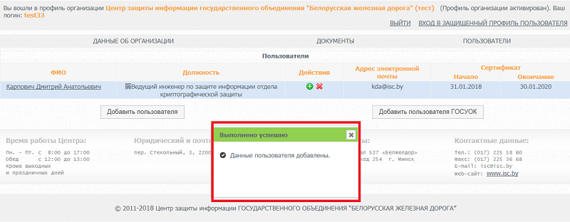 После авторизации, контактное лицо, может создать пользователя (уполномоченное лицо, которое будет использовать электронную цифровую подпись).
