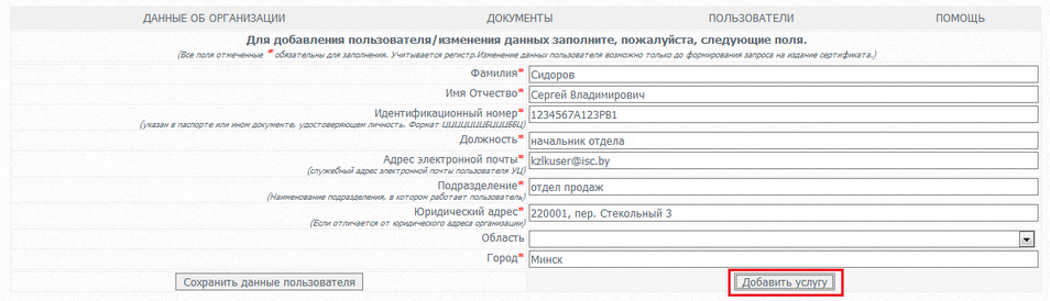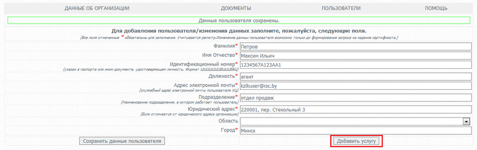 добавить пользователя, ввести и сохранить его данные. В появившемся окне нажать на кнопку "Добавить услугу".