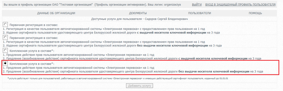Комплексная услуга в составе: 1. Продление действия прав пользователя автоматизированной системы «Электронная перевозка» на 1 год. 2. Продление (возобновление действия) сертификата пользователя удостоверяющего центра Белорусской железной дороги без выдачи носителя ключевой информации на 3 года. Нажать кнопку «Добавить услугу».