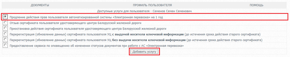 Выбрать услугу Продление действия прав пользователя автоматизированной системы «Электронная перевозка» на 1 год, нажать кнопку "Добавить услугу".