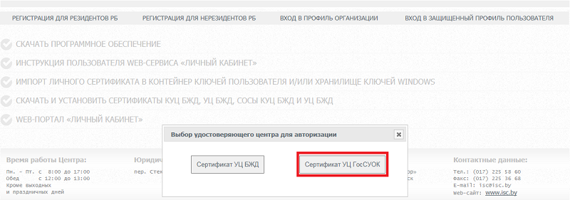 Для авторизации нажать кнопку "Сертификат УЦ ГосСУОК"