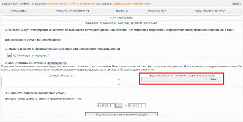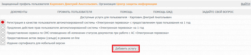 Выбрать услугу "Регистрация в качестве пользователя автоматизированной системы «Электронная перевозка» с предоставлением прав пользования на 1 год,