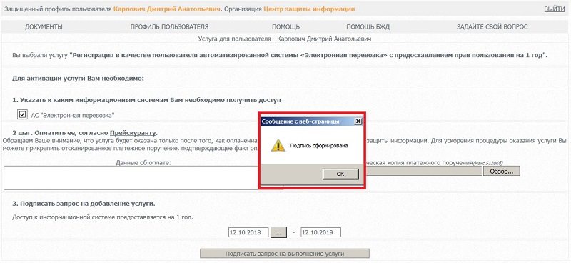 ШАГ 3. Подписать запрос на выполнение услуги.