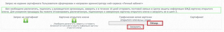 В пункте «Сформировать запрос на издание сертификата с генерацией ключевой пары Пользователя удостоверяющего центра Белорусской железной дороги.» (ШАГ 3 или ШАГ 4) выбрать файл с отсканированной подписанной у руководителя организации и заверенной карточкой открытого ключа нажатием по кнопке «Обзор», поместить в web-сервис «Личный кабинет» нажатием по кнопке «Загрузить»